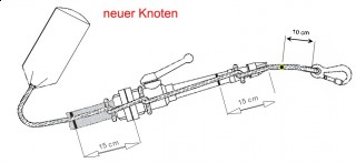 Für die diesjährigen Bewerbe gilt die österreichweite Änderung des Strahlrohrknotens (Kreuzklank und Schlag am Strahlrohr), welche der Anwendung in der Grundausbildung angepasst wurde. Damit muss der Karabiner vor dem Strahlrohrmundstück abgelegt werden. Zur eindeutigen Bewertung ist an der Leine eine Markierung (Isolierband) 10 cm nach dem Karabiner anzubringen. Diese Markierung muss sich nach Fertigstellung des Knotens, durch den Bewerber Nr. 7, vor dem Strahlrohrmundstück befinden. |